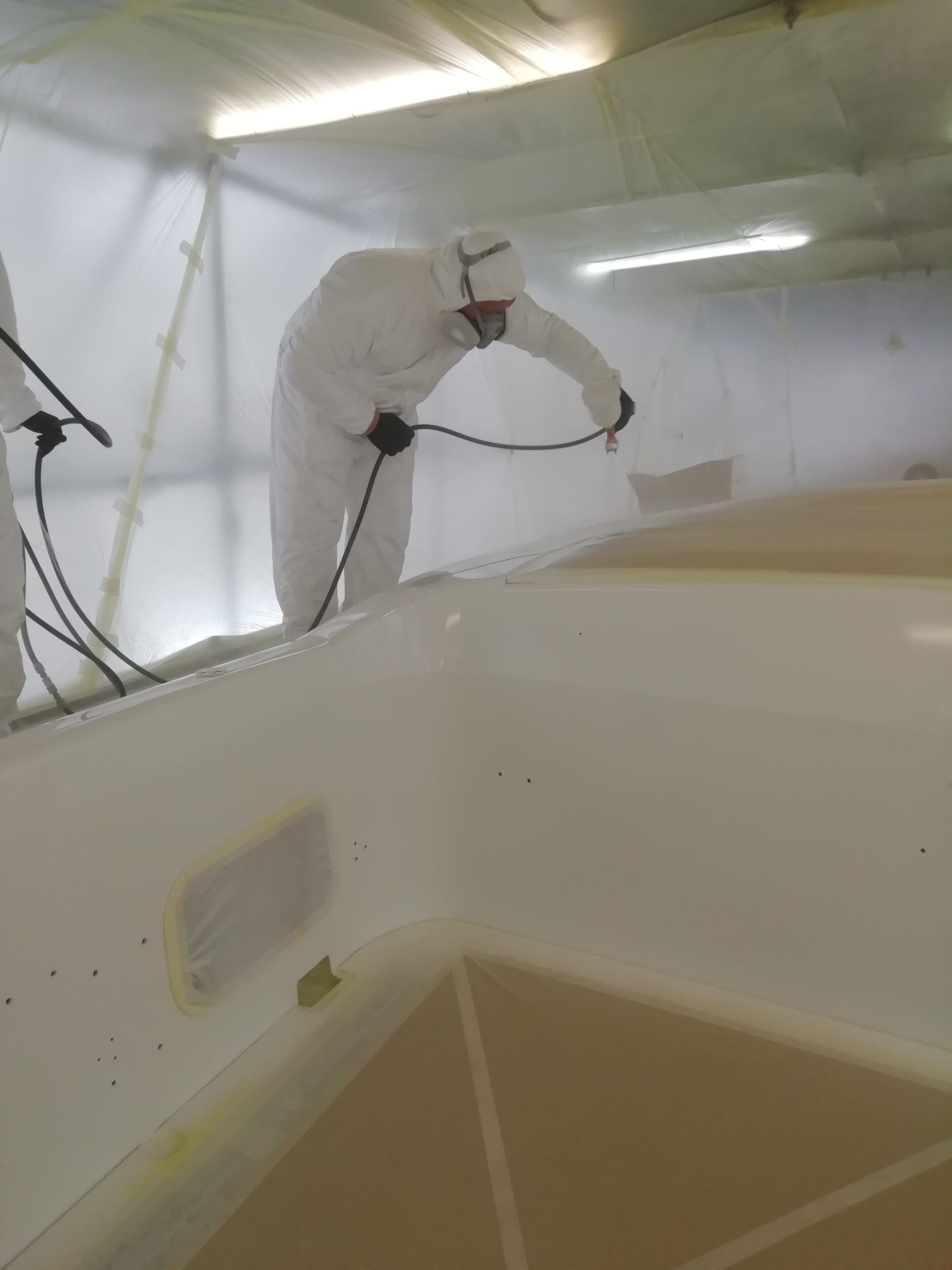 Ocean Coats Marine Services started the project by working on the mast, boom, spreaders, and radar domes. Each of these components was sanded and cleaned before applying Awlgrip's 545 Epoxy Primer, then sprayed with Awlcraft 2000. Ocean Coats carried out this work in different locations. The mast being 36m in length, was scaffolded and Shrink Wrapped . The spreaders and radar domes were worked upon in Ocean Coats' spray booth. Finally, the 12m boom was transported by Kingswell Haulage to Clarence Boatyard for the work to be carried out in Ocean Coats' shed.