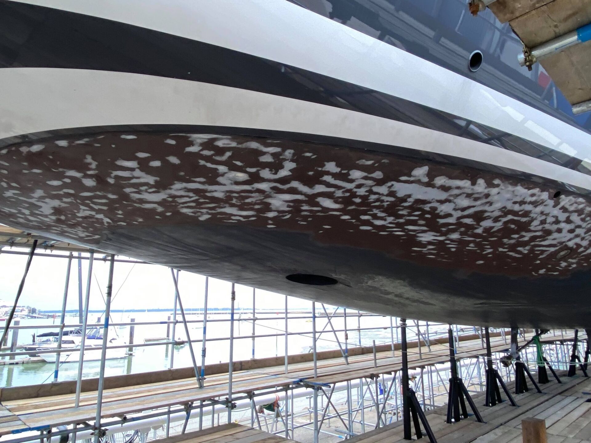 Next, on the 10th of September 2020, the Ocean Coats Team worked below Freya's waterline. Scraping and wet sanding removing all the old anti-foul on the vessel. Sanding the anti-foul was a long graft and took several days; Ocean Coats also carried out repairs on the keel bulb.